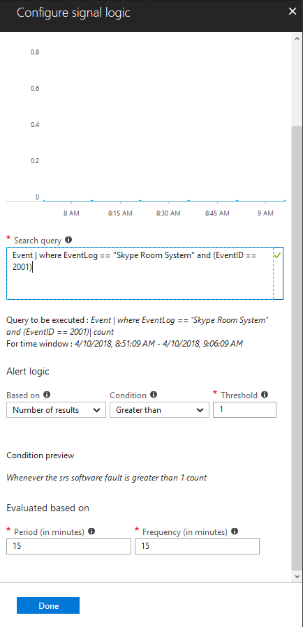 I’ve also said I want it to be monitored every 15 minutes, checking the previous 15 minutes and alert if it happens more than once (to avoid blips):